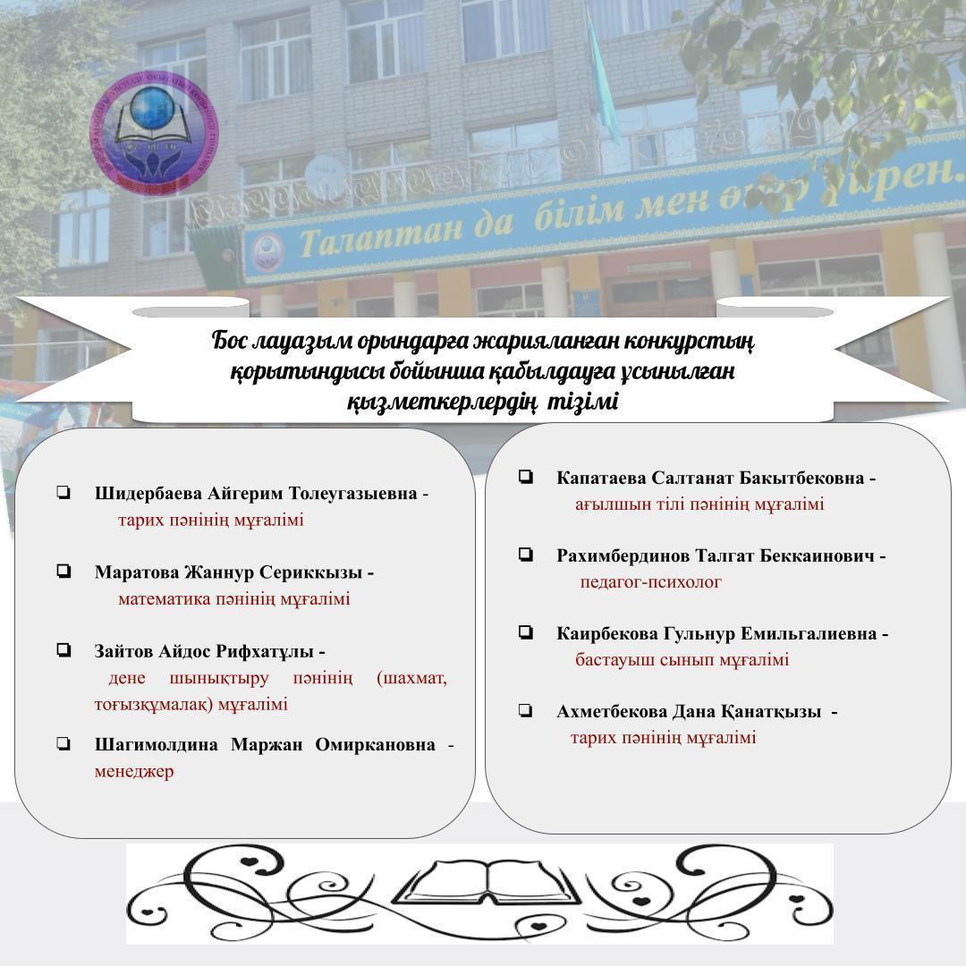 Педагогтерді жұмысқа қабылдау жаңа форматта конкурс және нақты талаптар бойынша жүзеге асырылып, бос орындар бойынша мына қызметкерлер жұмысқа қабылданды: