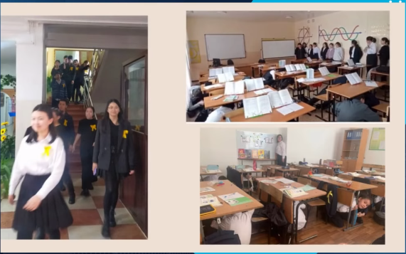 Шұғыл төтенше жағдайлар туындаған кездегі іс-әрекет дағдыларын қалыптастыру мақсатында өткізілген дабыл барысында 1-11 сынып оқушылары қауіпсіздік шараларын сақтап, оқу ғимаратынан жедел түрде шықты.