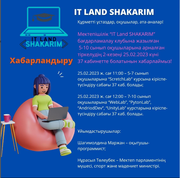 24 ақпан 2023 0 1 2 3 4 5 Хабарландыру, мектепішілік “IT Land SHAKARIM” бағдарламалау клубына қабылдау