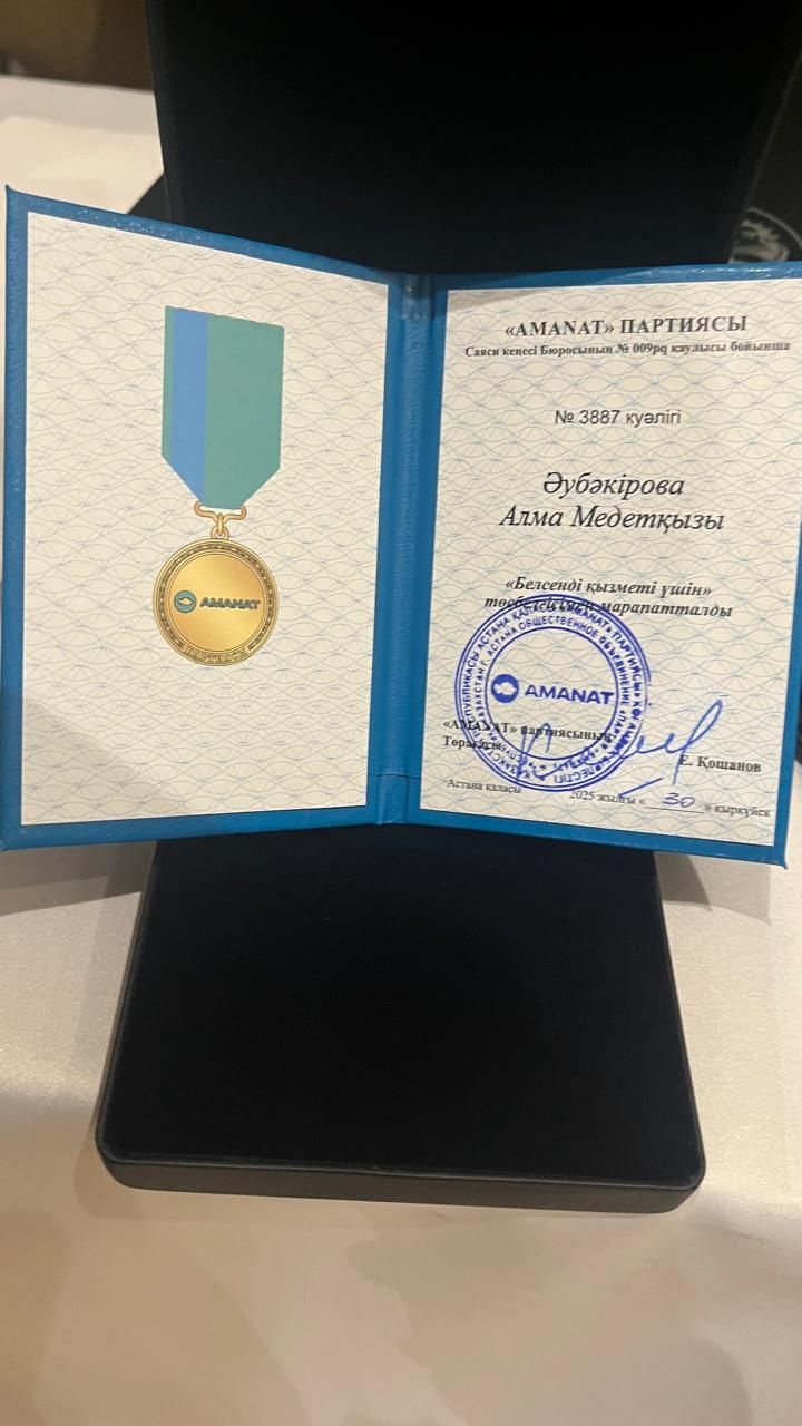 🏅 «AMANAT» партиясының «Белсенді қызметі үшін» төсбелгісімен марапатталды.