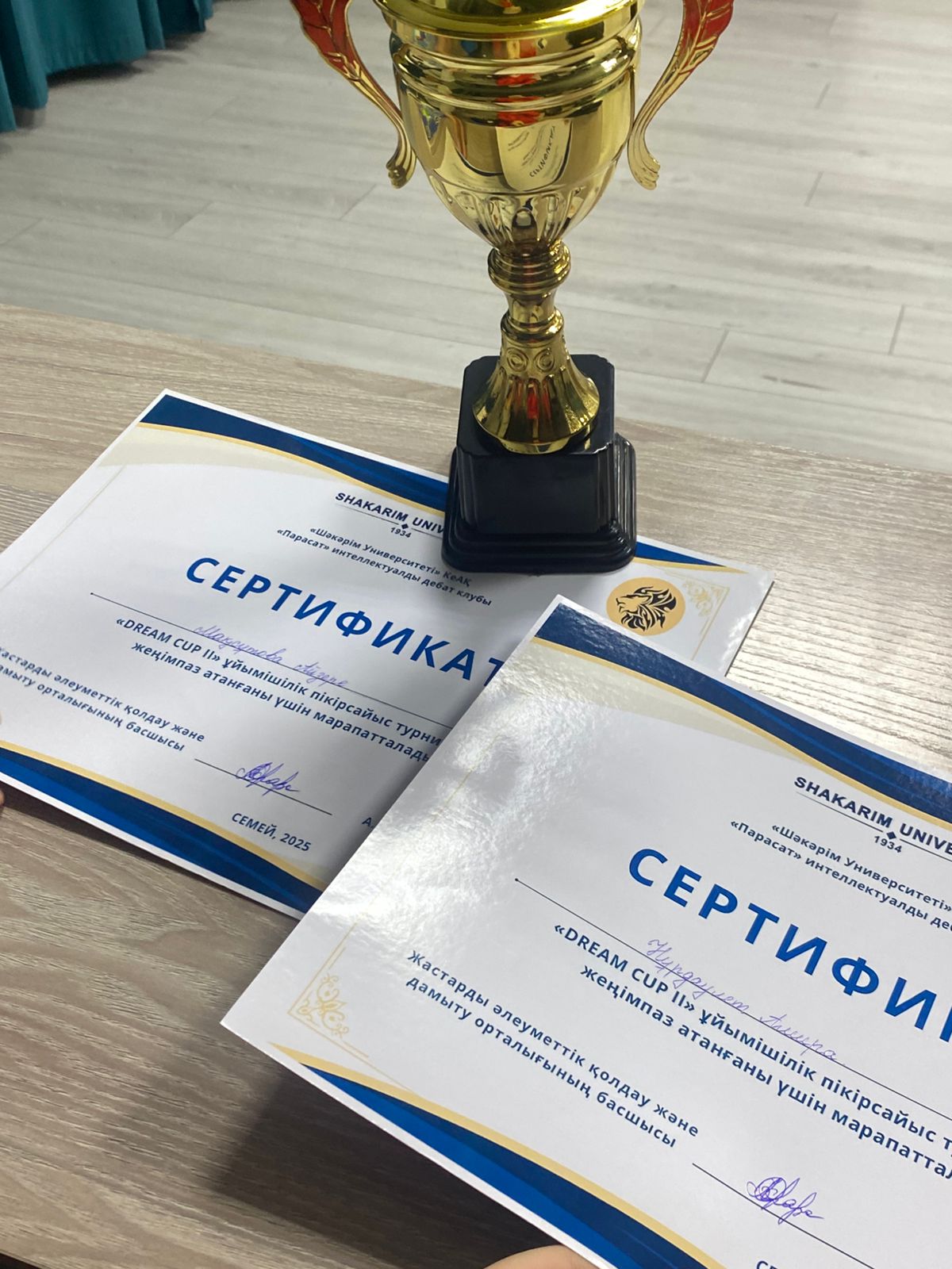 30.11.2025 ж.күні Шәкәрім университетінің "Парасат" дебат клубының ұйымдастыруымен студенттер арасындағы өткен "DREAM CUP II" қалалық пікірсайыс турнирде 1 орын алғаны үшін"Тарлан" дебат клубының спикері Нұрдәулет Амира кубокпен және грамотамен марапатталды.
