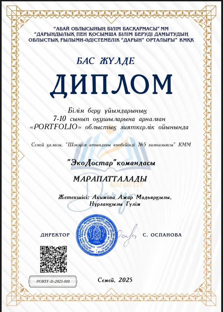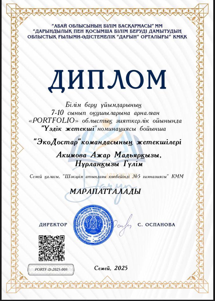 Абай облысы көлемінде өткен 7–10 сынып оқушыларына арналған «PORTFOLIO» зияткерлік ойынында гимназиямыздың "ЭкоДостар" командасы ерекше нәтиже көрсетіп, БАС ЖҮЛДЕГЕ ие болды! 🏆