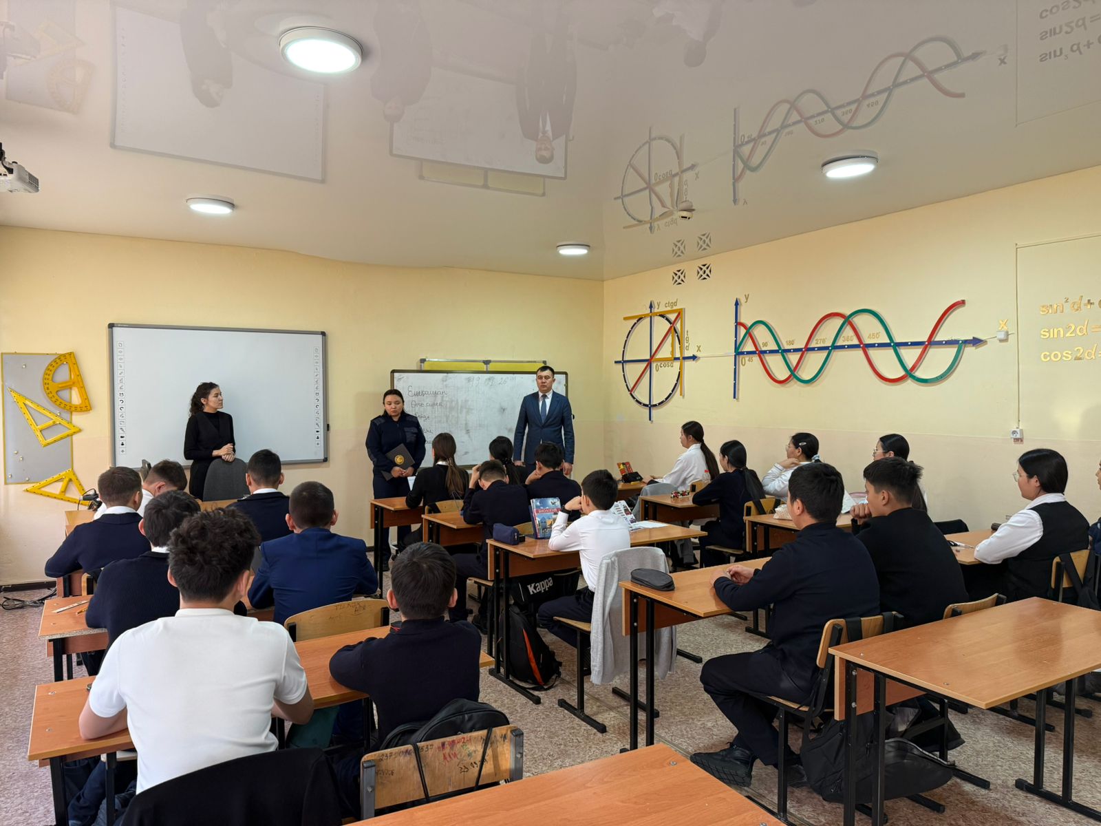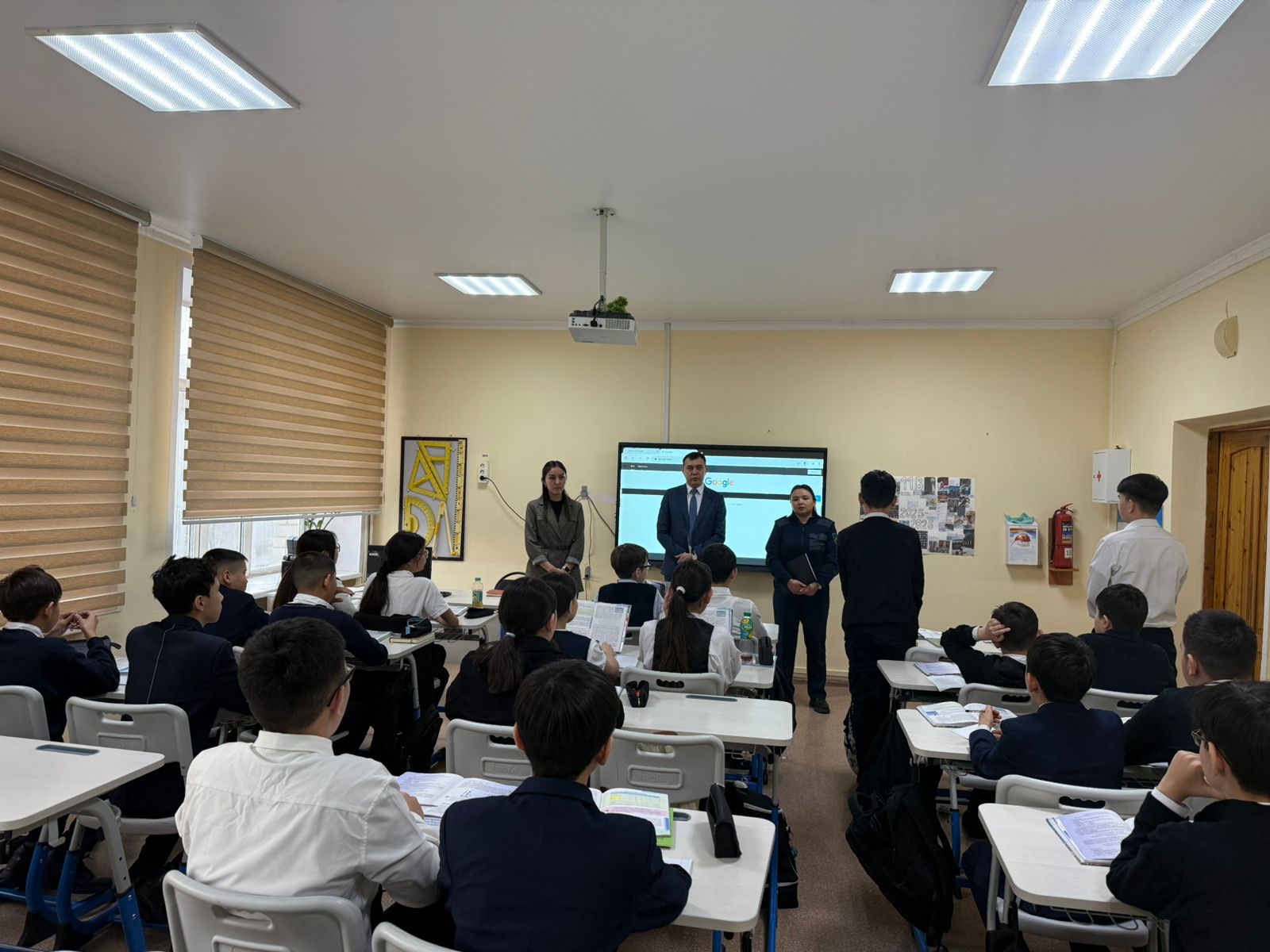 «Заң және тәртіп» айлығы аясында құқықтық сауаттылықты арттыру, заңға құрметпен қарау және азаматтық жауапкершілікті қалыптастыру мақсатында 2026 жылдың 19 қаңтарында Абай облысы ПД Семей қаласы Әуезов ПБ ҚҚБ инспекторы полиция лейтенанты Б.Е.Ергараева 5-8 сыныптар арасында «Құқық бұзушылықтың алдын алу», «Заң мамандықтары» тақырыбы бойынша дәріс жүргізді.