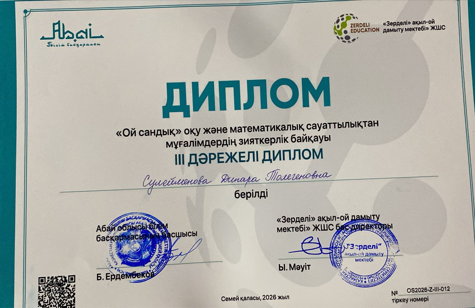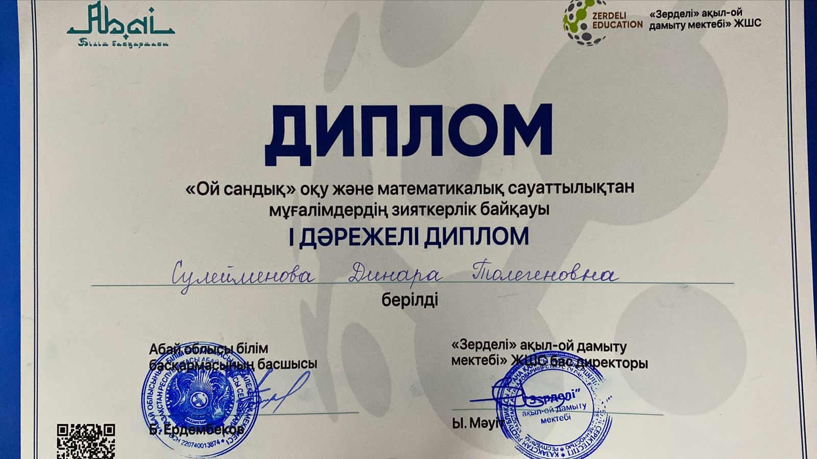 Облыстық “Ой-сандық” оқу және математикалық сауаттылықтан мұғалімдердің зияткерлік байқауының жеңімпазы