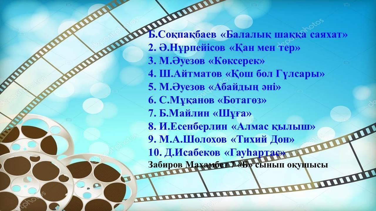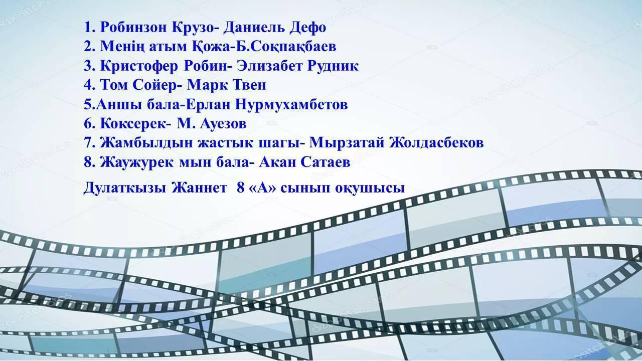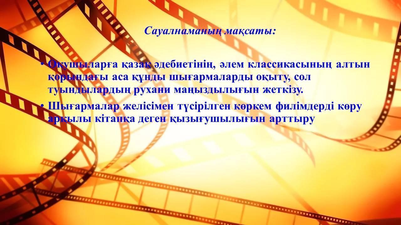 23 сәуір 2020 20 1 2 3 4 5 Көркем шығарма желісі бойынша түсірілген 10 кинофильмді атаңыз атты Сауалнама