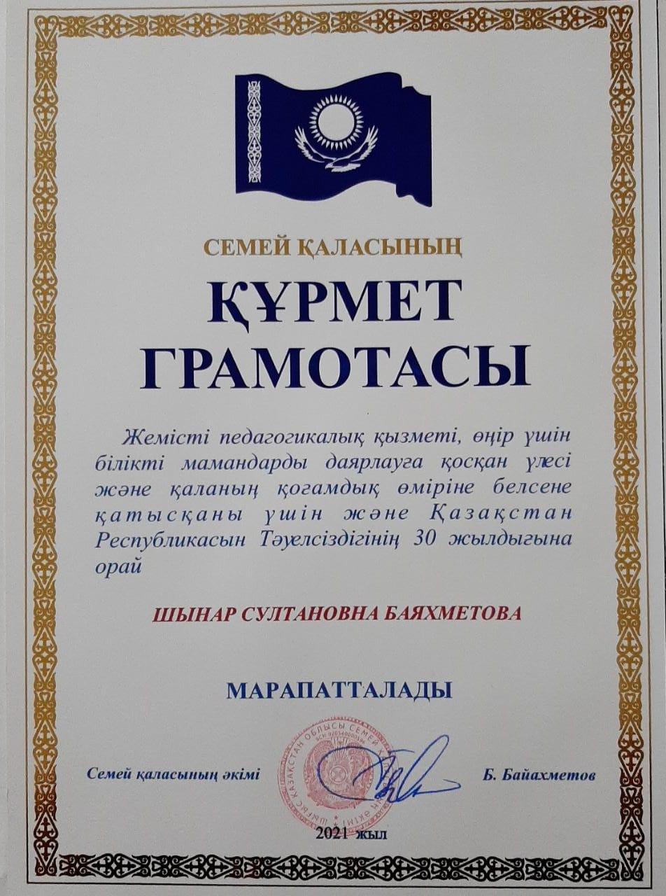 Жемісті педагогикалық қызметі, өңір үшін білікті мамандарды даярлауға қосқан үлесі және қаланың қоғамдық өміріне белсене қатысқаны үшін және Қазақстан Республикасы Тәуелсіздігінің 30 жылдығына орай мектеп директорының ақпараттандыру жөніндегі орынбасары Шынар Султановна Баяхметова қала әкімінің Құрмет Грамотасымен марапатталды.
