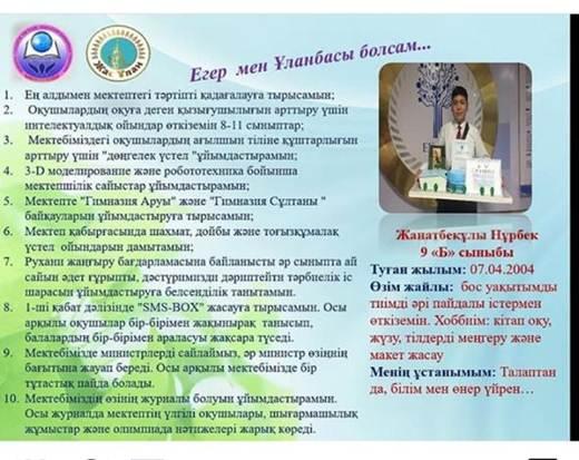 ҚР Тұңғыш Президентi күніне қарсы Шәкәрім атындағы үш тілде оқытатын көпбейінді гимназияның Ұланбасы сайлауының қорытындысы шықты. Жалпы барлық дауыстың 42% (162 дауыс)- Жанатбекұлы Нұрбек, 33%(128 дауыс) Серимханова Азиза, 15% (60дауыс)Толеугалиева Мадина өз қанжығасына байлады. Дауыс беру кезінде 10%(35) бланкі түсініксіз және бірнеше кандидатты белгілегендіктен жарамсыз деп танылды. Ұланбасы сайлауы оқушылардың барлық қырларын ашуға мүмкіндік берді. Оқушылар өз бағдарламаларын ұсыну барысында көпшіліктің ойын да алға тартты. Ұланбасына және бірге жұмыс жасайтын командасына үлкен сенім артып, сәттілік тілейміз.