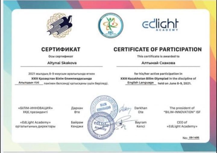 2021 жылдың 8-9 маусым аралығында өткен ХХІІІ Қазақстан Білім олимпиадасында ағылшын тілі пәні бойынша І орын иеленген гимназиямыздың 9 сынып оқушысы Скакова Алтынайжы жеңісімен құттықтаймыз!
