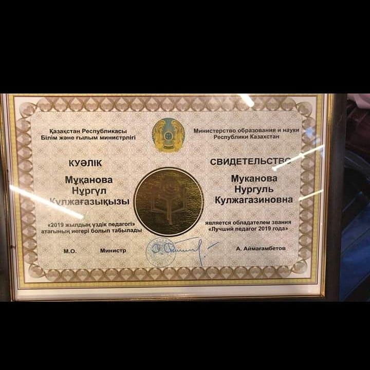 Мұқанова Нұргүл Құлжағазықызы республика бойынша " Үздік ұстаз-2019" байқауының жеңімпазы атанды.